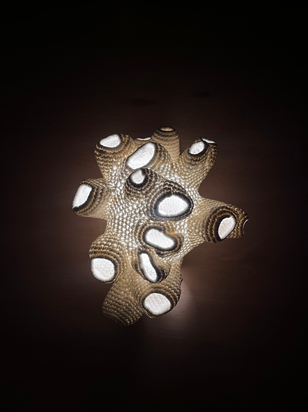The works unfold through repetition and guiding principles, producing forms that do not imitate but echo shapes found in nature. Soft textile layers are stabilized into rigid structures, creating forms that feel both vulnerable and self-supporting. Light acts as an active element, filtering through surfaces and extending the sculpture into the surrounding space. Each object subtly shifts the atmosphere it inhabits.